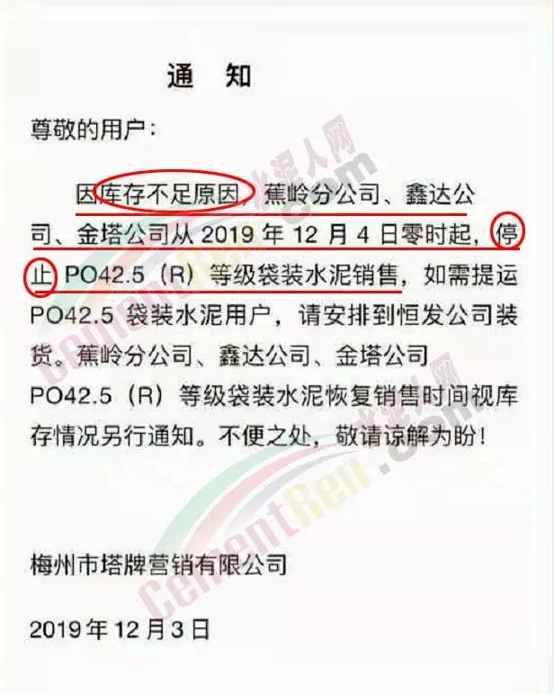 昨日(12月3日),梅州市塔牌營銷有限公司發(fā)布通知稱,因庫存不足原因,焦嶺分公司、鑫達(dá)公司、金塔公司從今日(12月4日)零時起停止PO42.5(R)等級袋裝水泥銷售,如需提運(yùn)PO42.5(R)袋裝水泥用戶,請安排到恒發(fā)公司裝貨。焦嶺分公司、鑫達(dá)公司、金塔公司PO42.5(R)袋裝水泥恢復(fù)銷售時間視庫存情況另行通知。