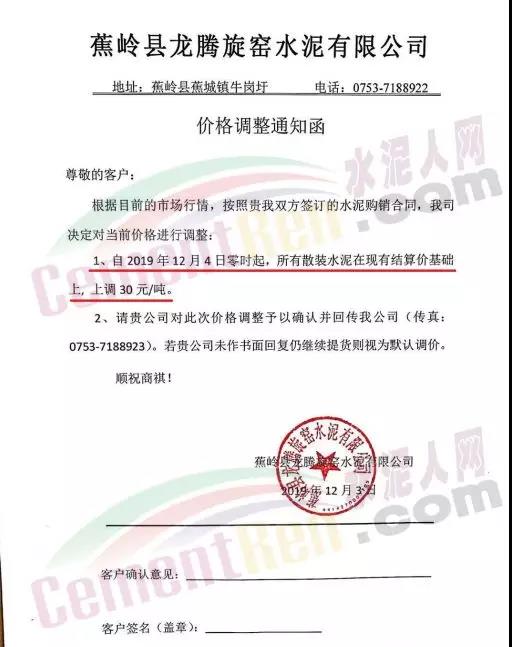 根據(jù)當(dāng)前市場形勢及產(chǎn)銷存實際情況,經(jīng)公司研究決定,定于2019年12月3日00:00起對袋裝、散裝各品種水泥價格上調(diào)20元/噸。