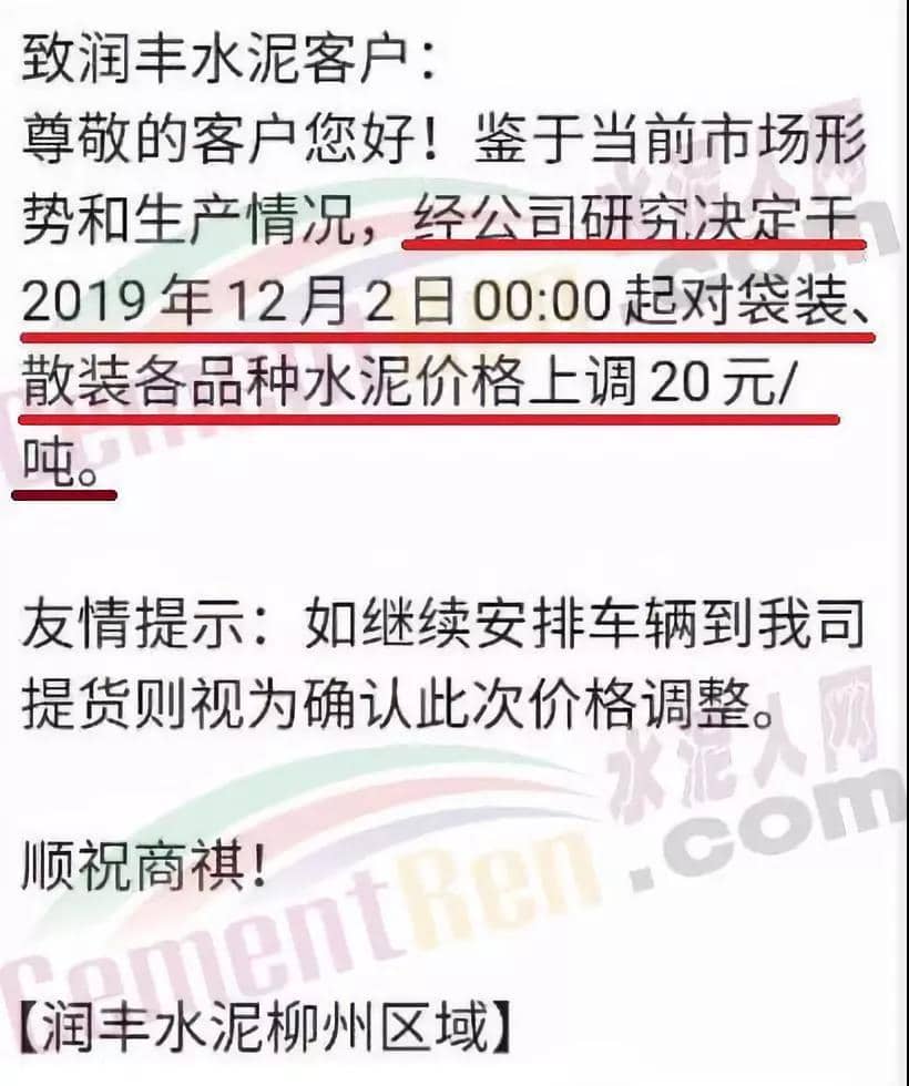 華潤水泥廣西市場部梧州區(qū)域發(fā)通知稱, 根據(jù)當(dāng)前市場形勢及產(chǎn)銷存實際情況,經(jīng)公司研究決定,定于2019年12月3日00:00起對袋裝、散裝各品種水泥價格上調(diào)20元/噸。