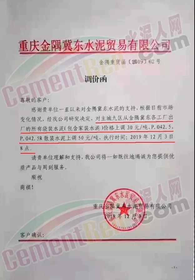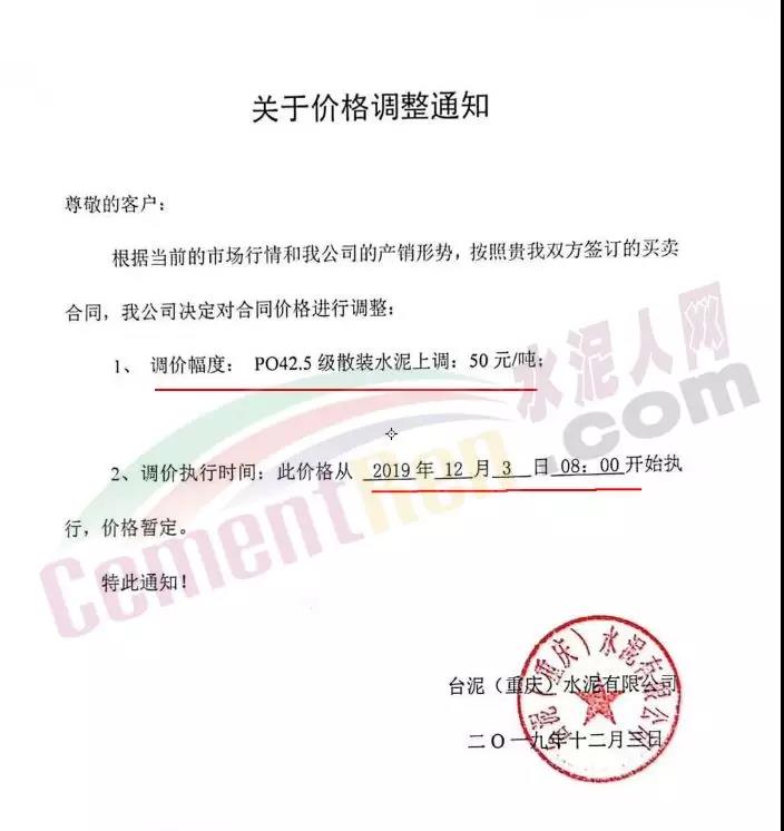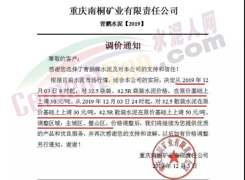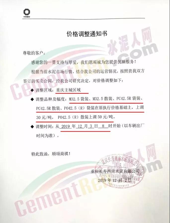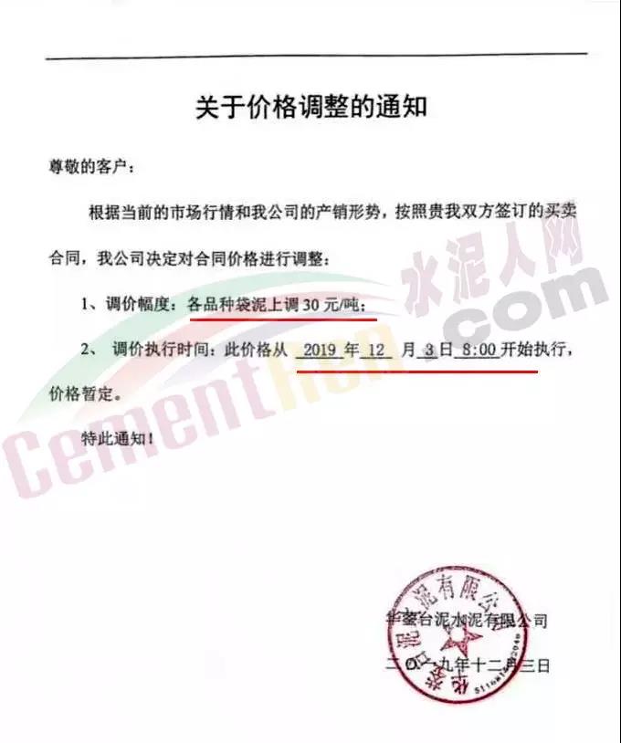 近期,因市場(chǎng)原因,經(jīng)研究決定,自2019年12月5日零時(shí)起,發(fā)往貴公司區(qū)域的各品種散、袋水泥在原有價(jià)格基礎(chǔ)上上調(diào)30元/噸;