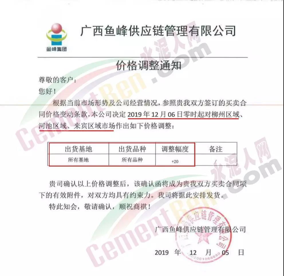 廣東佛山市多家水泥企業(yè)通知自12月有6日起上調(diào)水泥價格,各標(biāo)號水泥上調(diào)20元/噸。