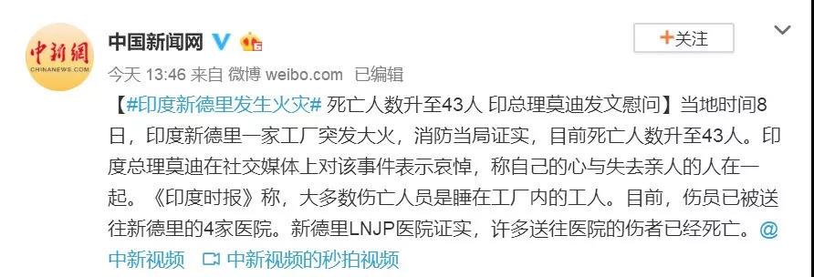 據(jù)外媒報道,當?shù)貢r間12月8日(昨日),印度新德里一家工廠突發(fā)大火,消防當局證實,目前死亡人數(shù)升至43人。