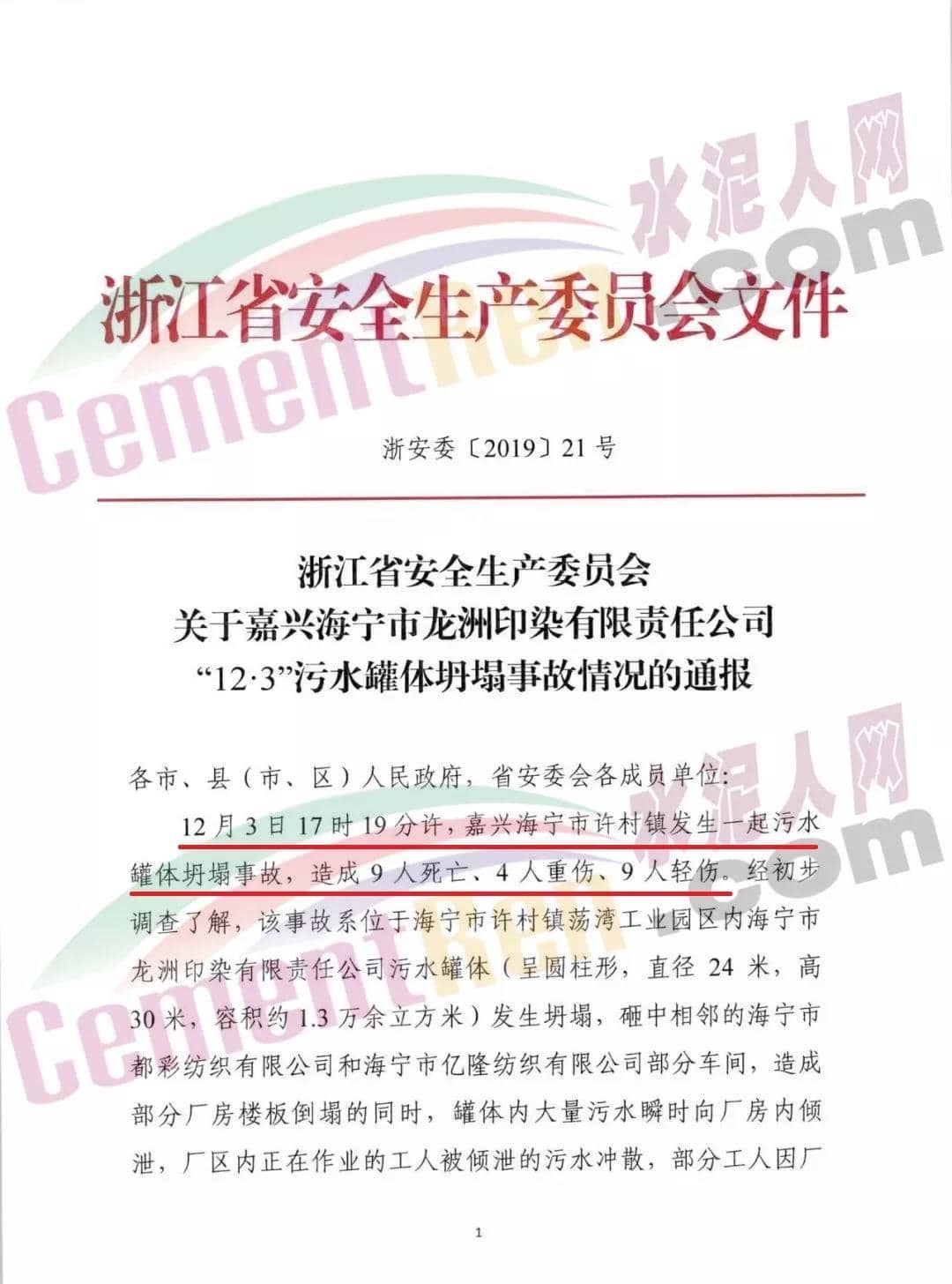 經(jīng)初步調(diào)查了解,該事故系位于海寧市許村鎮(zhèn)蕩灣工業(yè)園區(qū)內(nèi)海寧市龍洲印染有限責(zé)任公司污水罐體(呈圓柱形,直徑24米,高30米,容積約1.3萬立方米)發(fā)生坍塌,砸中相鄰的海寧市都彩紡織有限公司和海寧市億隆紡織有限公司部分車間,造成部分廠房樓板倒塌的同時(shí),罐體內(nèi)大量污水瞬時(shí)向廠房?jī)?nèi)傾泄,廠區(qū)內(nèi)正在作業(yè)的工人被傾泄的污水沖散,部分工人因廠區(qū)內(nèi)屯放的布匹坍倒受壓,造成人員傷亡。目前,事故原因正在進(jìn)一步調(diào)查中。