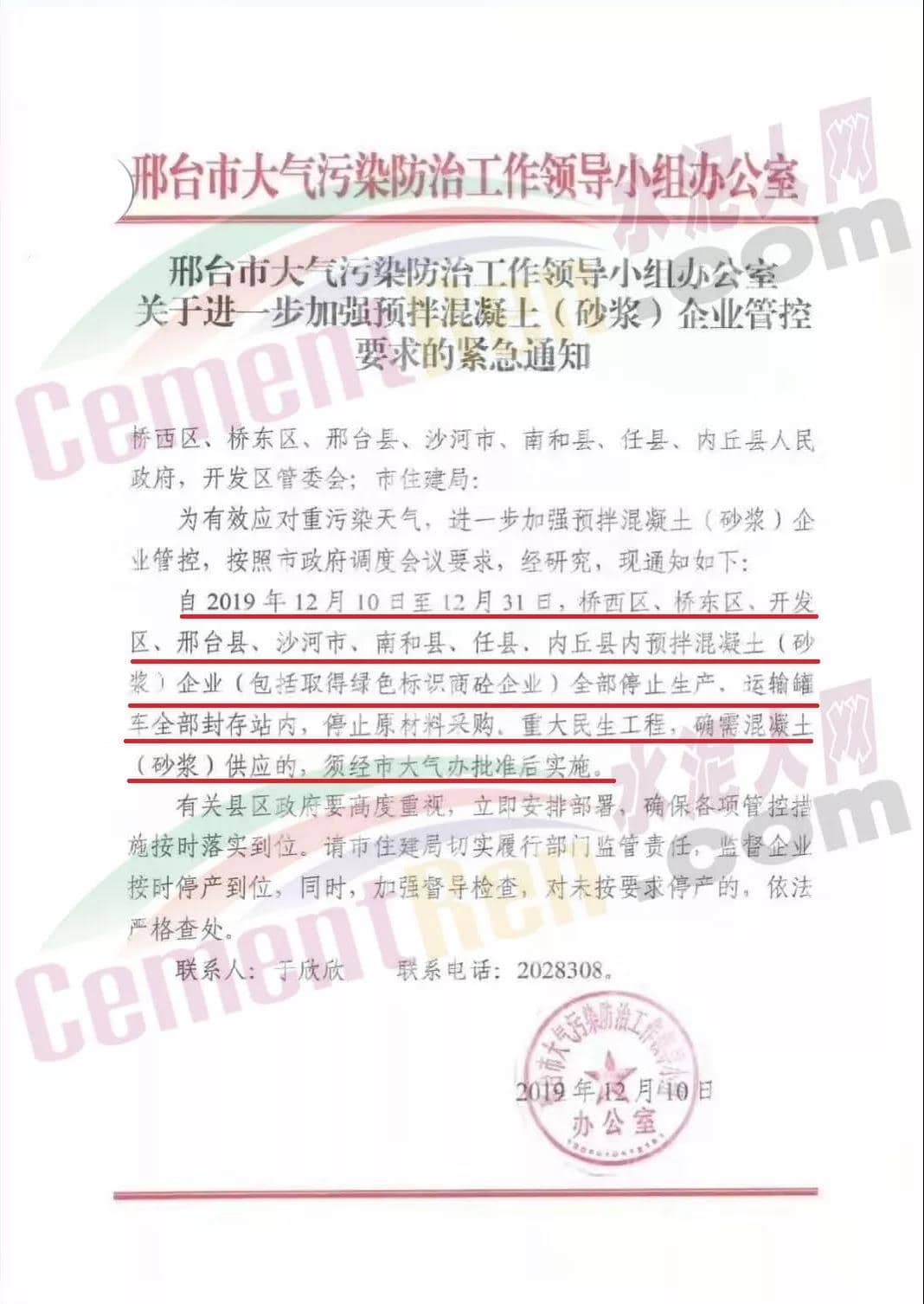為有效應(yīng)對(duì)重污染天氣,進(jìn)一步加強(qiáng)預(yù)拌混凝土(砂漿)企業(yè)管控,按照市政府調(diào)度會(huì)議要求,決定自2019年12月10日至12月31日,橋西區(qū)、橋東區(qū)、開發(fā)區(qū)、邢臺(tái)縣、沙河市、南和縣、任縣、內(nèi)丘縣內(nèi)預(yù)拌混凝土企業(yè)全部停止生產(chǎn),運(yùn)輸罐車全部封存站內(nèi),停止原材料采購,重大民生工程,確需混凝土供應(yīng)的,必須經(jīng)市大氣辦批準(zhǔn)后實(shí)施。