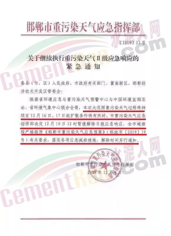 9日,河北省邯鄲市重污染天氣應(yīng)急指揮部也發(fā)布了《關(guān)于繼續(xù)執(zhí)行重污染天氣二級(jí)應(yīng)急響應(yīng)的緊急通知》稱,根據(jù)省環(huán)境應(yīng)急于重污染天氣預(yù)警中心與中國環(huán)境監(jiān)測總站,省環(huán)境氣象臺(tái)中心聯(lián)合會(huì)商,本次大范圍重污染天氣過程將持續(xù)至12月16日,17日起擴(kuò)散條件將有所好。邯鄲市重污染天氣應(yīng)急指揮部決定12月10日12時(shí)暫緩解除二級(jí)應(yīng)急響應(yīng),全市域繼續(xù)嚴(yán)格按照《邯鄲市重污染天氣應(yīng)急預(yù)案》(邯政字【2019】19號(hào))有關(guān)要求,落實(shí)各項(xiàng)應(yīng)急減排措施,解除時(shí)間另行通知。