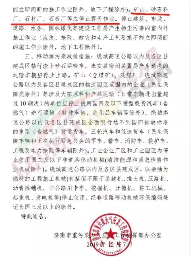 根據(jù)工業(yè)企業(yè)按照 2019 年度最新修訂的應(yīng)急減排清單采取限產(chǎn)停產(chǎn)等減排措施。停止水泥、砂石、渣土等易飛揚細顆粒材料和易揚塵垃圾清掃、歸方碼垛及裝卸作業(yè);停止切割、噴涂、粉刷、護坡噴漿、攪拌等室內(nèi)外作業(yè)(應(yīng)急、搶險、災和生產(chǎn)工藝要求不能立即間斷的施工作業(yè)除外,地下工程除外)。礦山、砂石料廠、石材廠、石板廠等應(yīng)停止露天作業(yè)。停止建筑、市政、道路、水務(wù)、園林綠化等建設(shè)工程易產(chǎn)生揚塵污染的室內(nèi)外施工作業(yè)(應(yīng)急、搶險、救災和生產(chǎn)工藝要求不能立即間斷的施工作業(yè)除外,地下工程除外)。