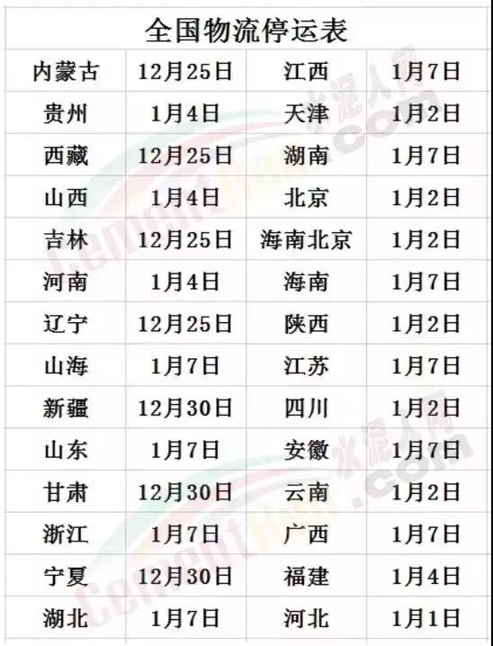 時至年底,隨著天氣寒冷和最近霧霾天氣嚴重,物流部發(fā)出聲明,全國物流停運時間已經(jīng)確定:內(nèi)蒙古、西藏、吉林、遼寧等地12月25日停運;新疆、甘肅、寧夏等地12月30日停運;河北1月1日停運;天津、北京、陜西、四川、云南等地1月2日停運;福建、貴州、山西、河南等地1月4日停運;上海、山東、浙江、湖北、江西、湖南、海南、江蘇、安徽、廣西等地1月7日停運。