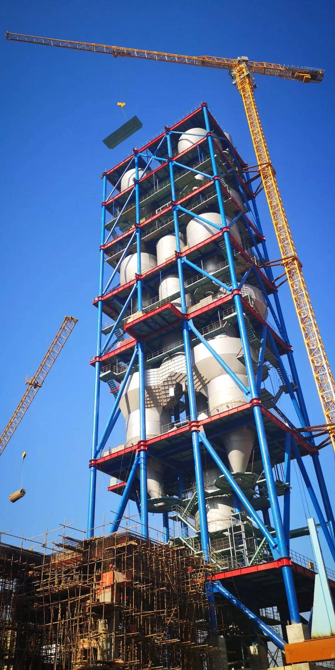 回轉(zhuǎn)窯窯尾是項目建設(shè)中的最高建筑,主要包括預(yù)熱器、分解爐等大型設(shè)備,在整個工藝流程中擔(dān)負生料喂入旋風(fēng)筒、循環(huán)預(yù)熱分解后入窯的重要作用。8月18日貴州尖峰項目的設(shè)備安裝“第一吊”,也是從窯尾開始的。