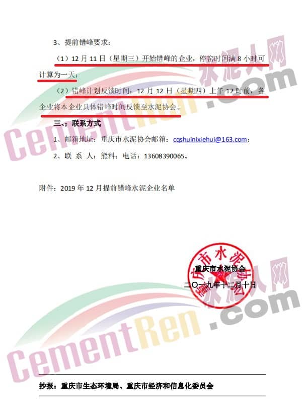 (1)12 月 11 日(星期三)開始錯(cuò)峰的企業(yè),停窯時(shí)間滿 8 小時(shí)可計(jì)算為一天;(2)錯(cuò)峰計(jì)劃反饋時(shí)間:12 月 12 日(星期四)上午 12 時(shí)前,各企業(yè)將本企業(yè)具體錯(cuò)峰時(shí)間反饋至水泥協(xié)會(huì)。