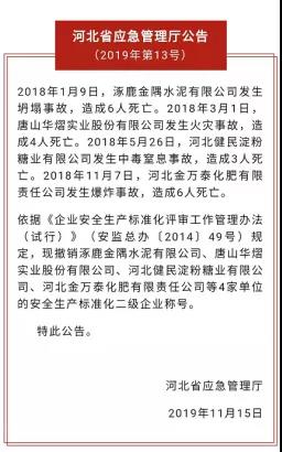 前不久,河北省應(yīng)急管理廳發(fā)布2019年第13號(hào)公告稱,2018年1月9日發(fā)生在河北省張家口市涿鹿金隅水泥有限公司發(fā)布坍塌事故,造成6人死亡。依據(jù)《企業(yè)安全生產(chǎn)標(biāo)準(zhǔn)化評(píng)審工作管理辦法(試行)》規(guī)定,撤銷涿鹿金隅水泥有限公司安全生產(chǎn)標(biāo)準(zhǔn)化二級(jí)企業(yè)稱號(hào)。