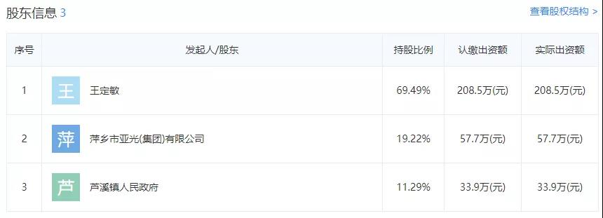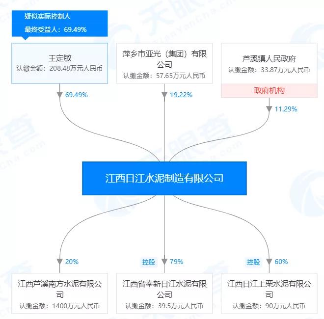 相關(guān)數(shù)據(jù)顯示江西日江水泥制造有限公司疑似實際控制人王定敏擁有企業(yè)69.49%的股份,為第一大股東;第二大股東為萍鄉(xiāng)市亞光(集團)有限公司,占股19.22%。第三大股東為蘆溪鎮(zhèn)人民政府,占股11.29%。