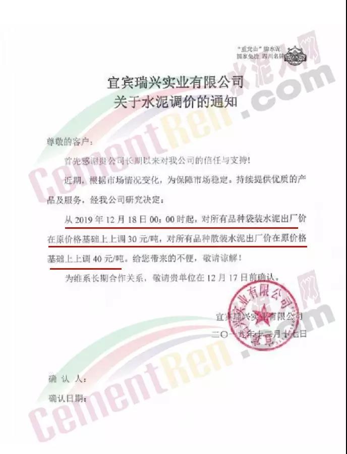 宜賓瑞興實業(yè)有限公司調(diào)價通知稱自18日0時起,對所有袋裝水泥出廠價上調(diào)30元/噸,,所有散裝水泥出廠價上調(diào)40元/噸。