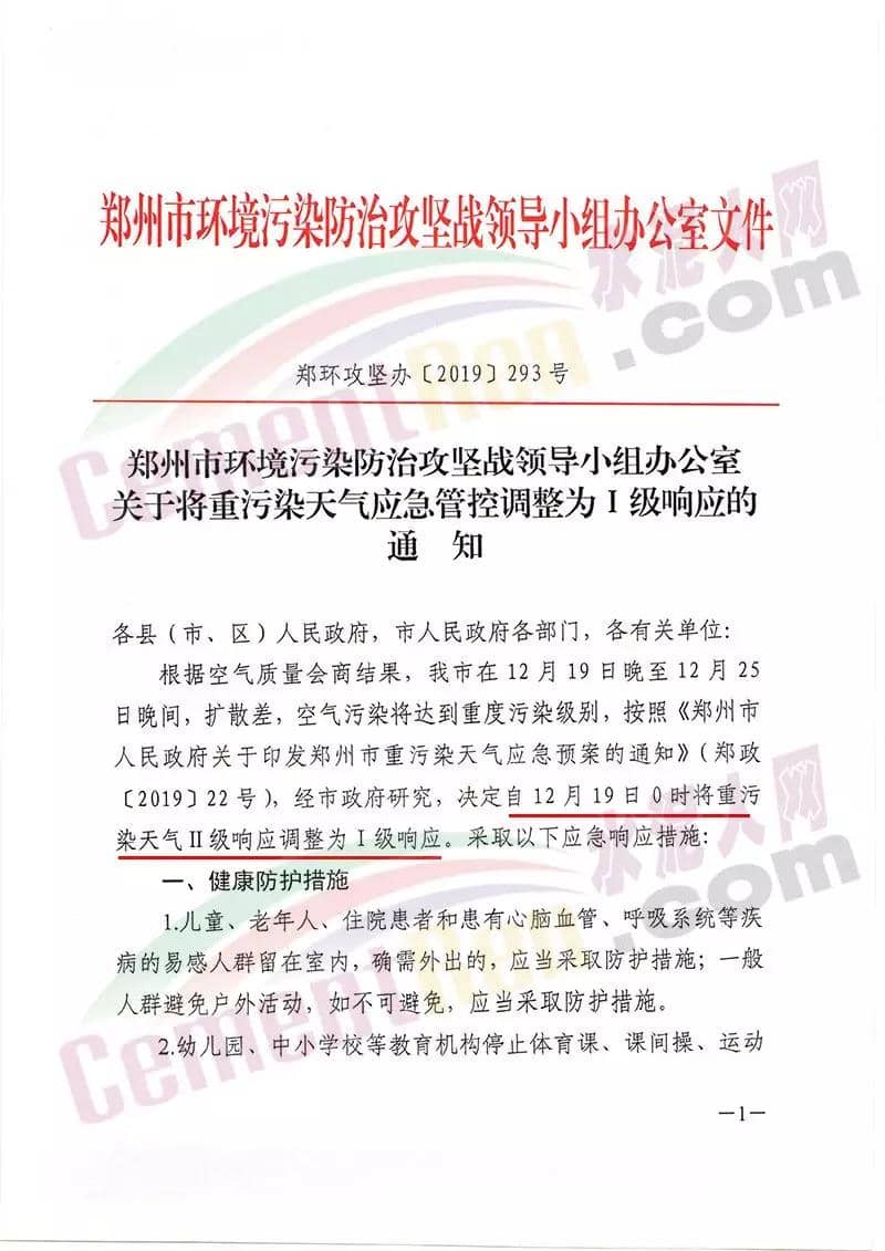 日前,鄭州市環(huán)境污染防治攻堅戰(zhàn)領(lǐng)導(dǎo)小組辦公室發(fā)布《關(guān)于將重污染天氣應(yīng)急管控調(diào)整為I級響應(yīng)的通知》稱根據(jù)空氣質(zhì)量會商結(jié)果,經(jīng)鄭州市政府研究決定自12月19日0時將重污染天氣II級響應(yīng)調(diào)整為I級響應(yīng)。