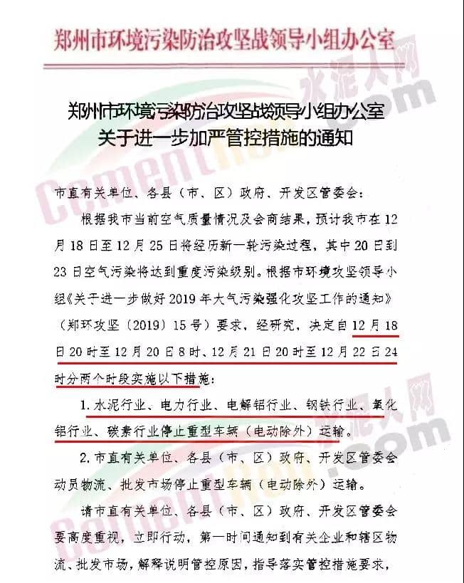 同期,鄭州市還發(fā)布了另一份文件要求自12月18日20時至12月20日8時、12月21日20時至12月22日24時分水泥行業(yè)、電力行業(yè)、電解鋁行業(yè)、鋼鐵行業(yè)、氧化鋁行業(yè)、碳素行業(yè)停止重型車輛(電動除外)運輸。