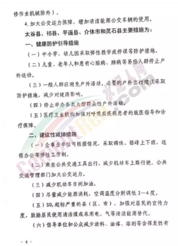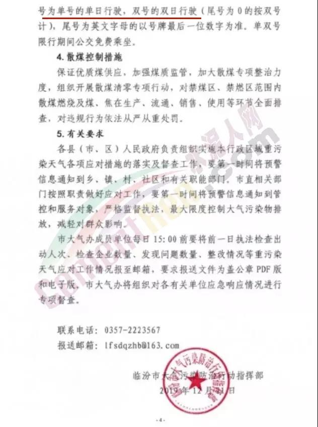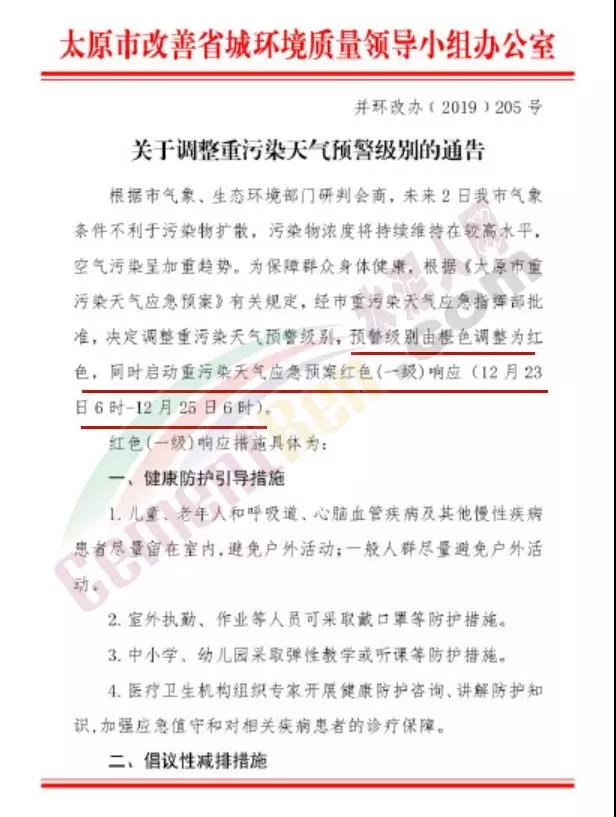 同日,太原市公安局關(guān)于發(fā)布重污染天氣臨時(shí)交通管理措施的通告稱根據(jù)太原市改善省城環(huán)境質(zhì)量領(lǐng)導(dǎo)小組《關(guān)于調(diào)整重污染天氣預(yù)警級別的通告》(并環(huán)改辦[2019]205號)和《太原市重污染天氣應(yīng)急預(yù)案》規(guī)定,接市重污染天氣應(yīng)急指揮部通知,決定調(diào)整重污染天氣預(yù)警級別,預(yù)警級別由橙色調(diào)整為紅色,同時(shí)啟動重污染天氣應(yīng)急預(yù)案紅色(一級)響應(yīng)(12月23日0時(shí)—12月25日0時(shí))。為應(yīng)對空氣重污染、保護(hù)公眾健康,市政府決定,對在本市行政區(qū)域內(nèi)道路行駛的機(jī)動車(含臨時(shí)號牌車輛)采取臨時(shí)交通管理措施。