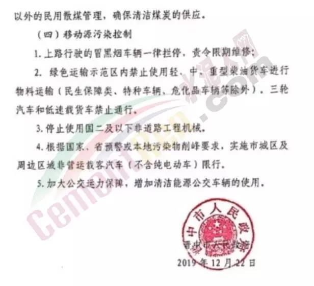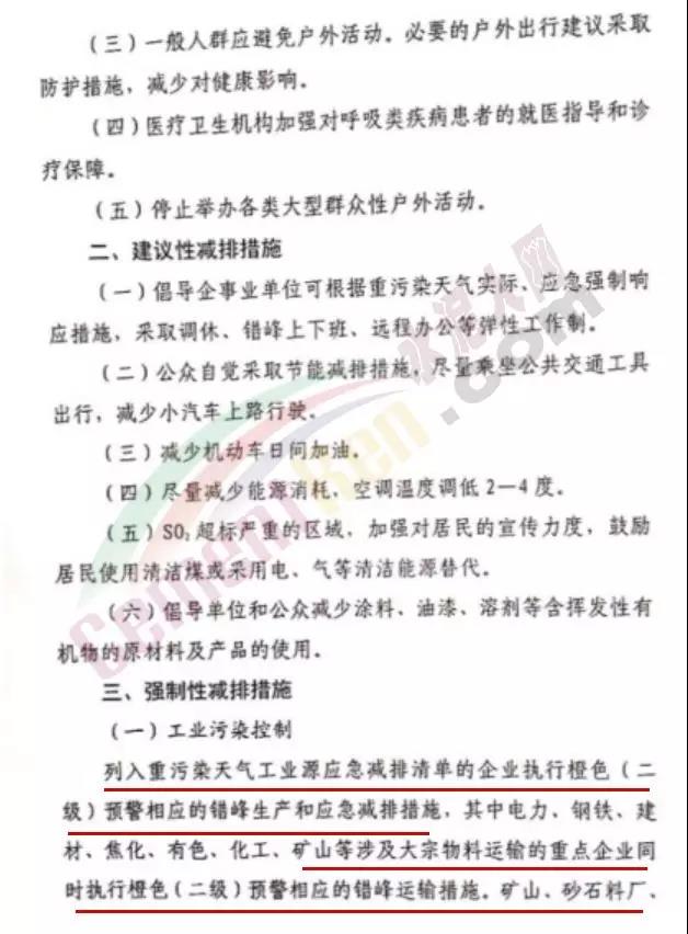 (一)工業(yè)源停限產(chǎn)措施。1、鋼鐵行業(yè)。承擔(dān)供暖任務(wù)的企業(yè):在橙色預(yù)警減排措施基礎(chǔ)上,燒結(jié)機(jī)、球團(tuán)裝備、石灰窯增加20%限產(chǎn)比例。不承擔(dān)供暖任務(wù)的企業(yè):績效評價(jià)等級為B級的,燒結(jié)機(jī)、球團(tuán)設(shè)備、石灰窯停產(chǎn)??冃гu價(jià)為C級的,燒結(jié)機(jī)、球團(tuán)設(shè)備、石灰窯停產(chǎn);高爐停產(chǎn)50%(含)以上。如預(yù)警響應(yīng)時(shí)間超過120小時(shí),之后時(shí)段燒結(jié)機(jī)、球團(tuán)裝備停產(chǎn)50%以上(以生產(chǎn)線計(jì)算停產(chǎn)比例)。鋼鐵企業(yè)停限產(chǎn)計(jì)劃要明確到具體裝備,各縣(市、區(qū))政府將鋼鐵企業(yè)停限產(chǎn)計(jì)劃統(tǒng)一匯總后于12月23日10時(shí)前報(bào)市應(yīng)急管理局和市環(huán)保指揮中心備案。2、其他行業(yè)。嚴(yán)格按照《重污染天氣應(yīng)急工業(yè)源污染物減排清單》中“橙色預(yù)警減排措施”執(zhí)行。(二)移動源限行措施。1、施工工地、工業(yè)企業(yè)廠區(qū)和工業(yè)園區(qū)內(nèi)停止使用國二及以下非道路移動機(jī)械。2、市中心城區(qū)環(huán)城路以內(nèi)以及各縣(市)區(qū)城區(qū),每天7時(shí)至20時(shí)禁止大型貨車(含持有通行證)、三輪汽車、低速載貨汽車通行,禁止建筑垃圾和渣土運(yùn)輸車、砂石運(yùn)輸車輛上路行駛。3、礦山、洗煤廠、港口、物流(除民生保障類)等涉及大宗原料和產(chǎn)品運(yùn)輸(日常車輛進(jìn)出量超過10輛)的單位禁止使用國四及以下重型載貨汽車(含燃?xì)?進(jìn)行運(yùn)輸。4、工業(yè)企業(yè)移動源限行措施執(zhí)行《關(guān)于印送〈關(guān)于加強(qiáng)重污染天氣應(yīng)對夯實(shí)應(yīng)急減排措施的指導(dǎo)意見〉的函》(環(huán)辦大氣函〔2019〕648號)相關(guān)條款。5、12月23日至26日,每天7時(shí)至20時(shí),全市黨政機(jī)關(guān)、事業(yè)單位、國有企業(yè)公務(wù)用車采取單雙號限行措施(含本地臨時(shí)牌照,不含外地車牌),單號單日通行,雙號雙日通行,尾號是字母的以最后一個(gè)數(shù)字為準(zhǔn)。(三)揚(yáng)塵源控制措施。1、礦山、沙石料廠、石材廠、石板廠等停止露天作業(yè);施工工地停止土石方作業(yè)、建筑拆除、噴涂粉刷、護(hù)坡噴漿、混凝土攪拌等;未安裝密閉裝置易產(chǎn)生遺撒的煤炭、渣土、砂石料等運(yùn)輸車輛停止上路。2、在常規(guī)作業(yè)基礎(chǔ)上,對城市主要干道增加機(jī)掃、吸掃等清潔頻次,但應(yīng)避開早、中、晚城市交通高峰期;主干道和易產(chǎn)生揚(yáng)塵路段應(yīng)增加機(jī)掃頻次。3、城市主城區(qū)、縣(市、區(qū))城區(qū)禁止燃放煙花爆竹和露天燒烤。