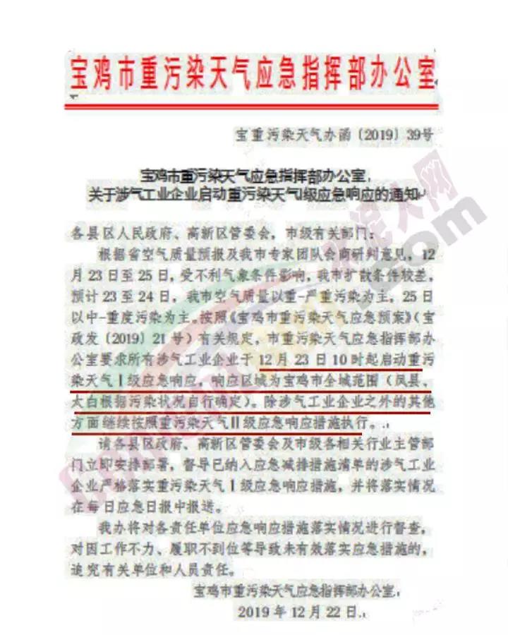 12月22日,陜西省寶雞市重污染天氣應(yīng)急指揮部辦公室要求所有涉氣工業(yè)企業(yè)于12月23日10時(shí)起啟動重污染天氣Ⅰ級應(yīng)急響應(yīng),響應(yīng)區(qū)域?yàn)閷氹u市全域范圍(鳳縣、太白根據(jù)污染狀況自行確定)。除涉氣工業(yè)企業(yè)之外的其他方面繼續(xù)按照重污染天氣Ⅱ級應(yīng)急響應(yīng)措施執(zhí)行。