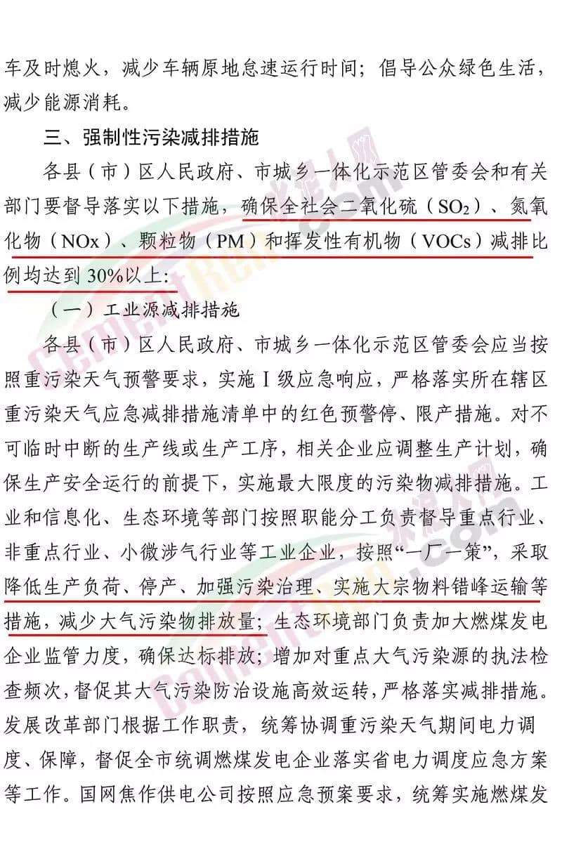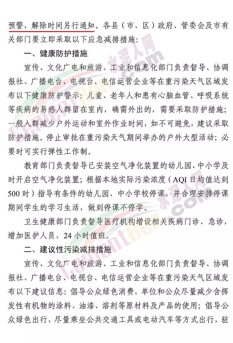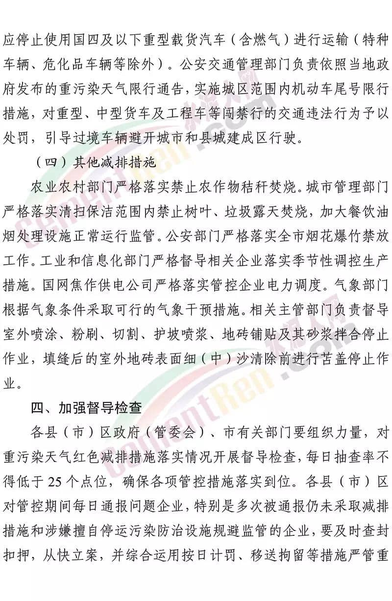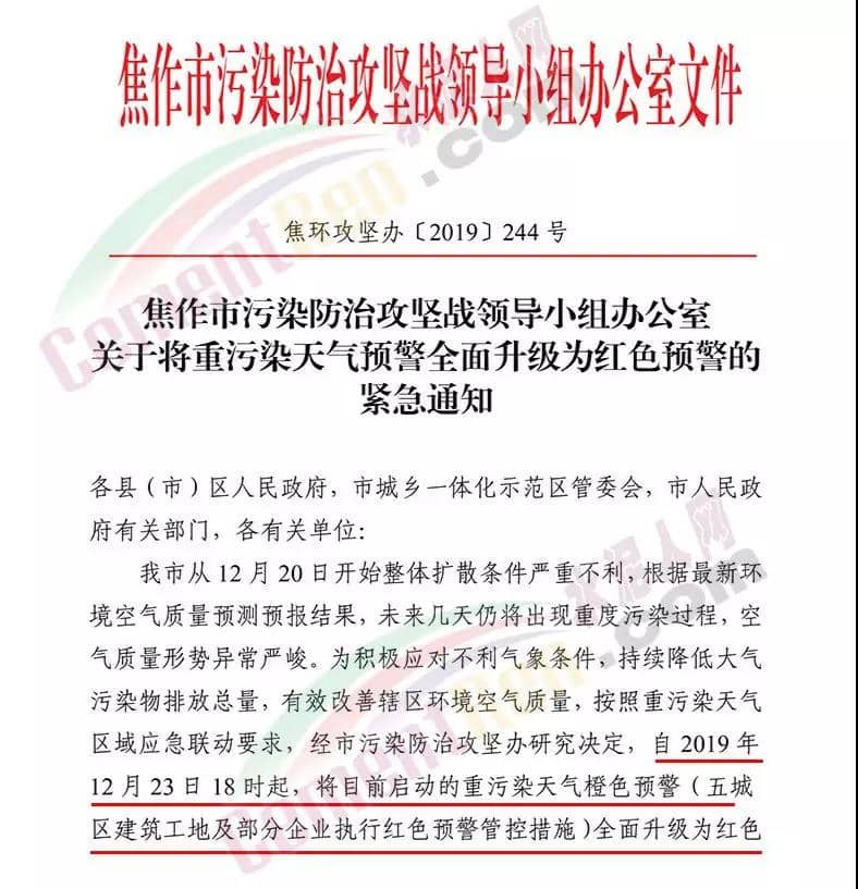昨日(12月23日)河南省焦作市污染防治攻堅戰(zhàn)領(lǐng)導(dǎo)小組辦公室印發(fā)《關(guān)于將重污染天氣預(yù)警全面升級為紅色預(yù)警的 緊急通知》稱,焦作市自 2019 年 12 月 23 日 18 時起,將目前啟動的重污染天氣橙色預(yù)警(五城 區(qū)建筑工地及部分企業(yè)執(zhí)行紅色預(yù)警管控措施)全面升級為紅色預(yù)警,解除時間另行通知。工業(yè)源減排措施 各縣(市)區(qū)人民政府、市城鄉(xiāng)一體化示范區(qū)管委會應(yīng)當(dāng)按照重污染天氣預(yù)警要求,實施Ⅰ級應(yīng)急響應(yīng),嚴(yán)格落實所在轄區(qū)重污染天氣應(yīng)急減排措施清單中的紅色預(yù)警停、限產(chǎn)措施。對不可臨時中斷的生產(chǎn)線或生產(chǎn)工序,相關(guān)企業(yè)應(yīng)調(diào)整生產(chǎn)計劃,確 保生產(chǎn)安全運行的前提下,實施最大限度的污染物減排措施。工業(yè)和信息化、生態(tài)環(huán)境等部門按照職能分工負(fù)責(zé)督導(dǎo)重點行業(yè)、 非重點行業(yè)、小微涉氣行業(yè)等工業(yè)企業(yè),按照“一廠一策”,采取 降低生產(chǎn)負(fù)荷、停產(chǎn)、加強污染治理、實施大宗物料錯峰運輸?shù)?措施,減少大氣污染物排放量。預(yù)警期間,嚴(yán)禁工業(yè)企業(yè)新開生產(chǎn)線或運行新的生產(chǎn)設(shè)備, 生產(chǎn)負(fù)荷不得超過預(yù)警前期生產(chǎn)負(fù)荷;長期停產(chǎn)及未建成企業(yè)復(fù) 產(chǎn)或試生產(chǎn)前,須向縣(區(qū))、市兩級污染防治攻堅辦報告,經(jīng)同意后方可進(jìn)行。揚塵源減排措施 礦山、砂石料廠、石材廠、石板廠等應(yīng)停止露天作業(yè);施工 工地停止室外作業(yè)。建筑垃圾清運車輛和砂石運輸車輛禁止上路行駛。開挖土石方的挖掘機等非道路移動機械停止作業(yè)。通知原文如下: