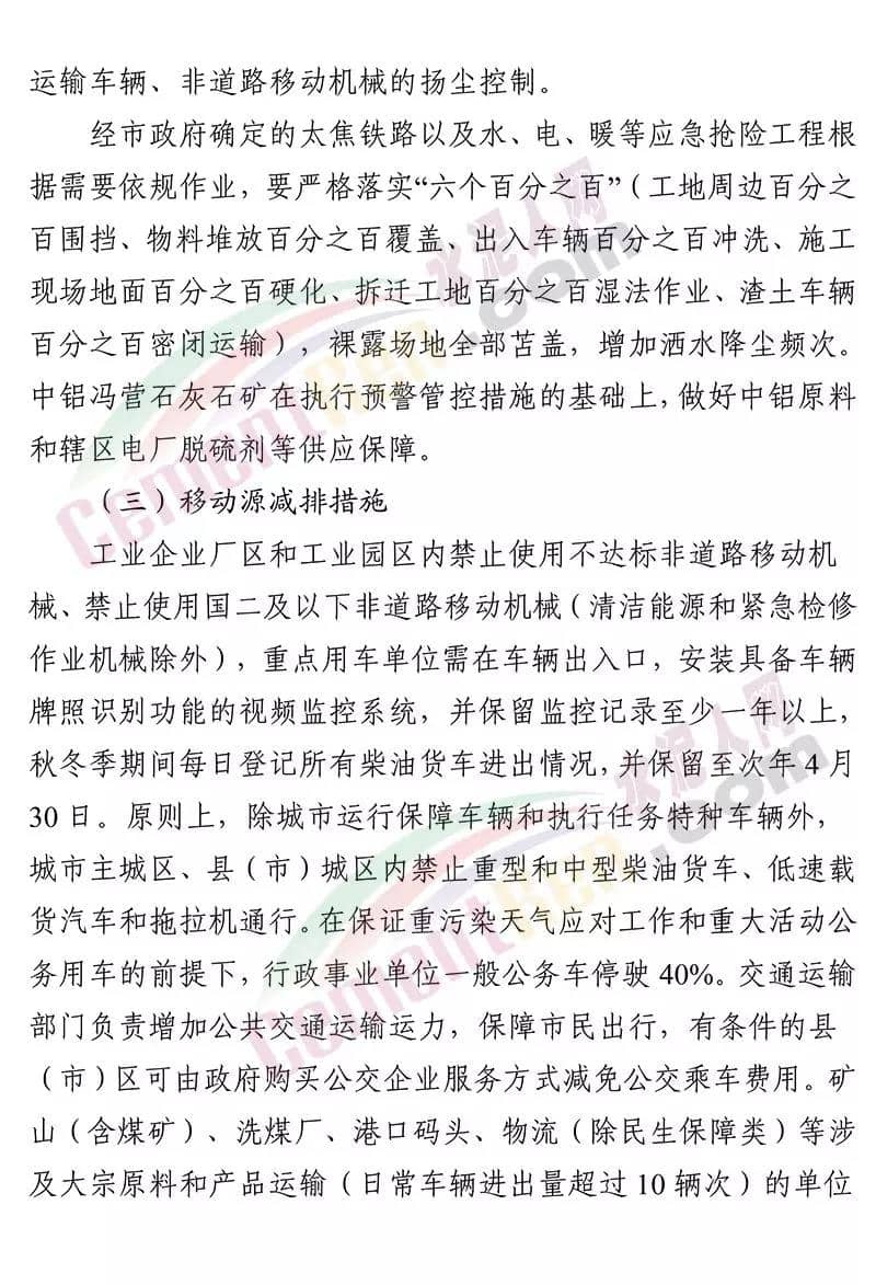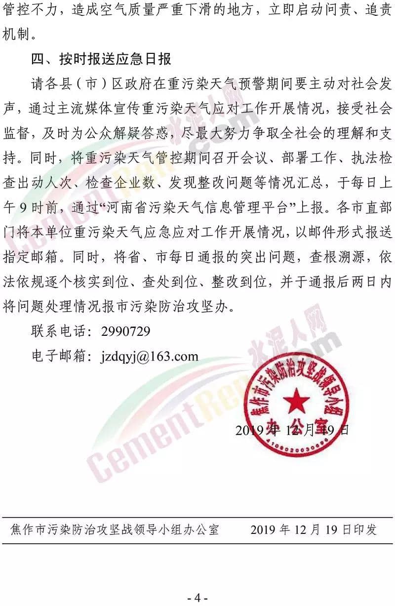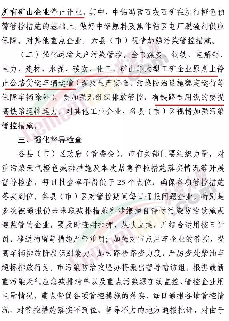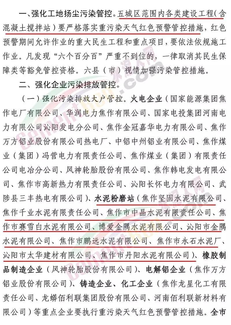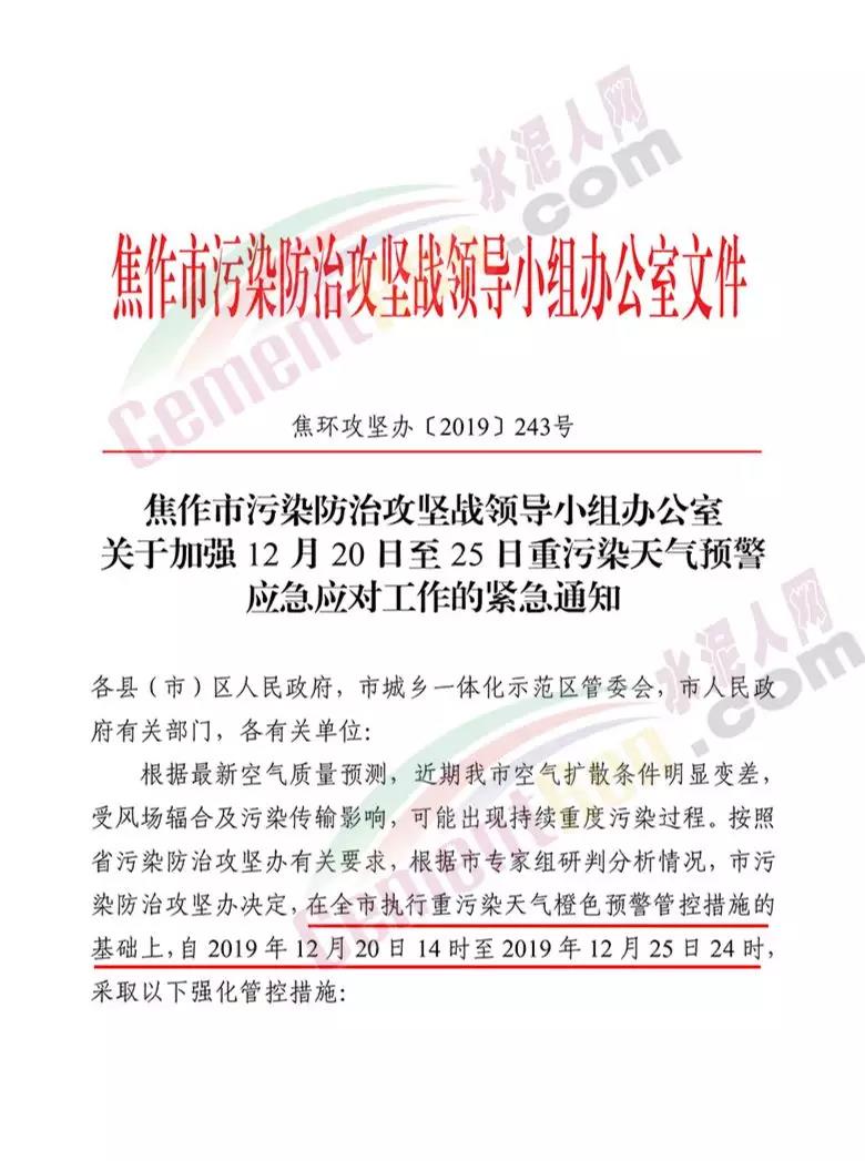 據(jù)了解,12 月 19 日焦作市污染防治攻堅戰(zhàn)領(lǐng)導(dǎo)小組辦公室 曾發(fā)布《關(guān)于加強 12 月 20 日至 25 日重污染天氣預(yù)警 應(yīng)急應(yīng)對工作的緊急通知》要求在全市執(zhí)行重污染天氣橙色預(yù)警管控措施的 基礎(chǔ)上,自 2019 年 12 月 20 日 14 時至 2019 年 12 月 25 日 24 時, 采取以下強化管控措施強化工地?fù)P塵污染管控。五城區(qū)范圍內(nèi)各類建設(shè)工程(含混凝土攪拌站)要嚴(yán)格落實重污染天氣紅色預(yù)警管控措施,紅色預(yù)警期間允許作業(yè)的重大民生工程和重點項目,要依法依規(guī)施工作業(yè)。強化污染排放大戶管控。水泥粉磨站(焦作堅固水泥有限公司、 焦作千業(yè)水泥有限責(zé)任公司、焦作市中晶水泥有限責(zé)任公司、焦作市賽雪白水泥有限公司、博愛金隅水泥有限公司、沁陽市金隅水泥有限公司、焦作市鵬遠(yuǎn)水泥有限公司、焦作市永石水泥廠、 沁陽市太華建材有限公司、焦作市丹陽水泥有限公司)。全市所有礦山企業(yè)停止作業(yè)。強化運輸大戶污染管控。全市煤炭、鋼鐵、電解鋁、 電力、建材、水泥、碳素、化工、礦山等大型工礦企業(yè)原則上停止公路貨運車輛運輸(涉及生產(chǎn)安全、污染防治設(shè)施穩(wěn)定運行等 保障車輛除外),要加強無組織排放管控,有鐵路專用線的要提高鐵路運輸運力。對其他工業(yè)企業(yè),各縣(市)區(qū)視情加強污染 管控措施。通知原文如下: