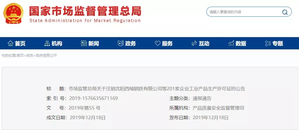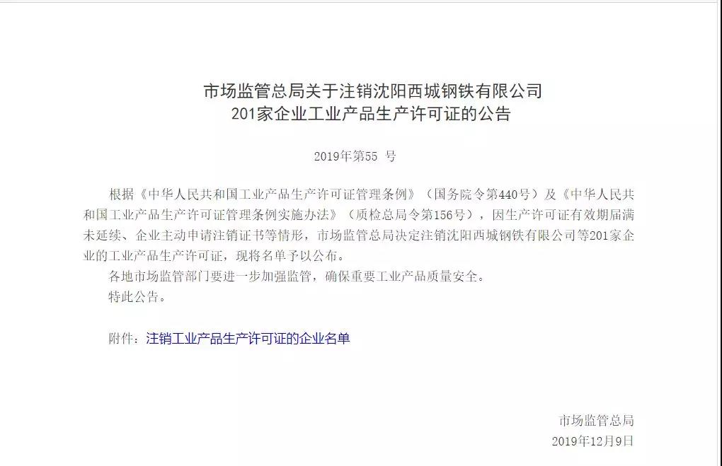 日前,國(guó)家市場(chǎng)監(jiān)督管理總局發(fā)布了《市場(chǎng)監(jiān)管總局關(guān)于注銷沈陽(yáng)西城鋼鐵有限公司201家企業(yè)工業(yè)產(chǎn)品生產(chǎn)許可證的公告》稱,根據(jù)《中華人民共和國(guó)工業(yè)產(chǎn)品生產(chǎn)許可證管理?xiàng)l例》(國(guó)務(wù)院令第440號(hào))及《中華人民共和國(guó)工業(yè)產(chǎn)品生產(chǎn)許可證管理?xiàng)l例實(shí)施辦法》(質(zhì)檢總局令第156號(hào)),因生產(chǎn)許可證有效期屆滿未延續(xù)、企業(yè)主動(dòng)申請(qǐng)注銷證書(shū)等情形。