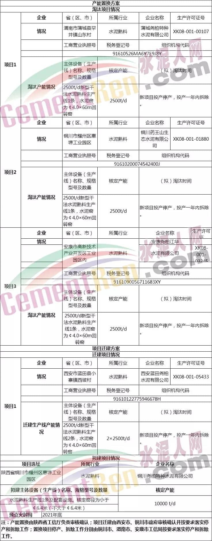 11月27日,陜西省工業(yè)和信息化廳發(fā)布了堯柏特種水泥集團(tuán)有限公司產(chǎn)能置換方案調(diào)整公告。公告稱,按照《國(guó)務(wù)院關(guān)于化解產(chǎn)能嚴(yán)重過(guò)剩矛盾的指導(dǎo)意見》(國(guó)發(fā)[2013]41號(hào))和《工業(yè)部水泥玻璃行業(yè)產(chǎn)能置換實(shí)施辦法》(工信部原〔2017〕337號(hào))精神,以及工信部《關(guān)于你省水泥企業(yè)能否執(zhí)行退城入園政策的復(fù)函》(工原函〔2019〕383號(hào))要求,將堯柏特種水泥集團(tuán)有限公司產(chǎn)能置換方案進(jìn)行調(diào)整公告,置換和遷建項(xiàng)目在新建項(xiàng)目投產(chǎn)前必須關(guān)停退出,投產(chǎn)一年內(nèi)必須拆除。具體方案如下: