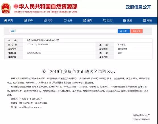 日前,國家自然資源部發(fā)布《關(guān)于2019年度綠色礦山遴選名單的公示》稱:按照《自然資源部辦公廳關(guān)于做好2019年度綠色礦山遴選工作的通知》(自然資辦函〔2019〕965號)要求,在企業(yè)自評、第三方評估、省級推薦基礎(chǔ)上,經(jīng)實(shí)地抽查、材料審核,共有556家礦山(不含原國家級綠色礦山試點(diǎn)單位)通過遴選。并將通過遴選的綠色礦山名單進(jìn)行公示,公示時(shí)間:2019年12月25日-12月31日。公示原文如下: