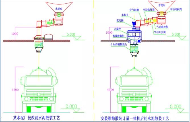 如下圖案例所示,水泥出料口到散裝機(jī)法蘭高度低于0.5米,目前大部分散裝平臺(tái)高度在5.5m以上,散裝罐車(chē)多數(shù)在4.3m以下。所有通過(guò)式散裝計(jì)量設(shè)備至少要求斜槽出料口到散裝機(jī)法蘭高度在1m以上。我公司將傳統(tǒng)平臺(tái)安裝的散裝機(jī)改為可以靈活布置的新型散裝機(jī),并利用原有散裝機(jī)的高度和散裝平臺(tái)下方高度來(lái)完成定量散裝的技術(shù)改造。