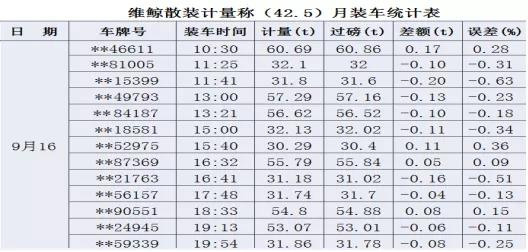 維鯨散裝計(jì)量秤目前已在水泥生產(chǎn)企業(yè)中有多個(gè)應(yīng)用案例,取得良好的應(yīng)用效果,以2019在安徽某水泥生產(chǎn)企業(yè)的實(shí)測(cè)數(shù)據(jù)記錄為例,可以看出使用該系統(tǒng)后的計(jì)量精度均保持在1%以內(nèi),在一個(gè)月內(nèi)無(wú)返車(chē)打料或加裝的現(xiàn)象,完全可達(dá)到一次裝車(chē)完成無(wú)超載出廠的情況。