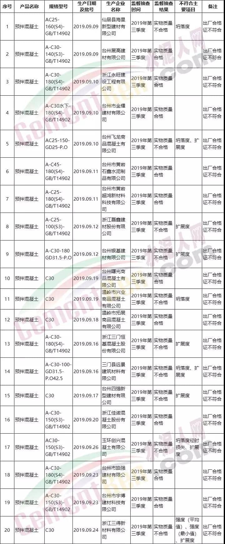 12月24日,臺州市市場監(jiān)督管理局官網(wǎng)發(fā)布2019年預(yù)拌混凝土產(chǎn)品質(zhì)量專項監(jiān)督抽查結(jié)果信息。