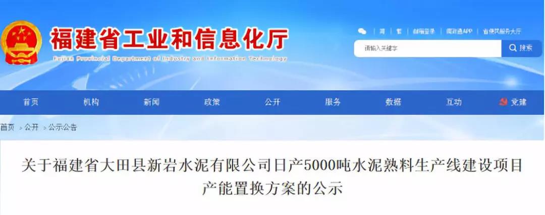 同期,福建省工業(yè)和信息化廳發(fā)布了《關(guān)于福建省大田縣新巖水泥有限公司日產(chǎn)5000噸水泥熟料生產(chǎn)線建設(shè)項目產(chǎn)能置換的公示》,原文如下: