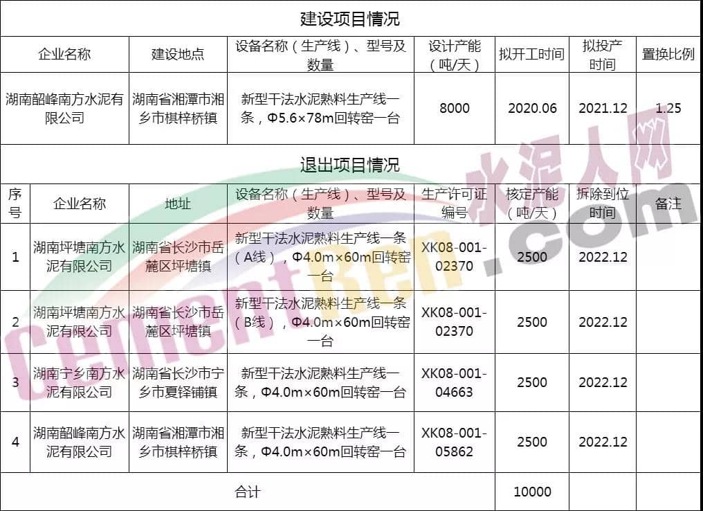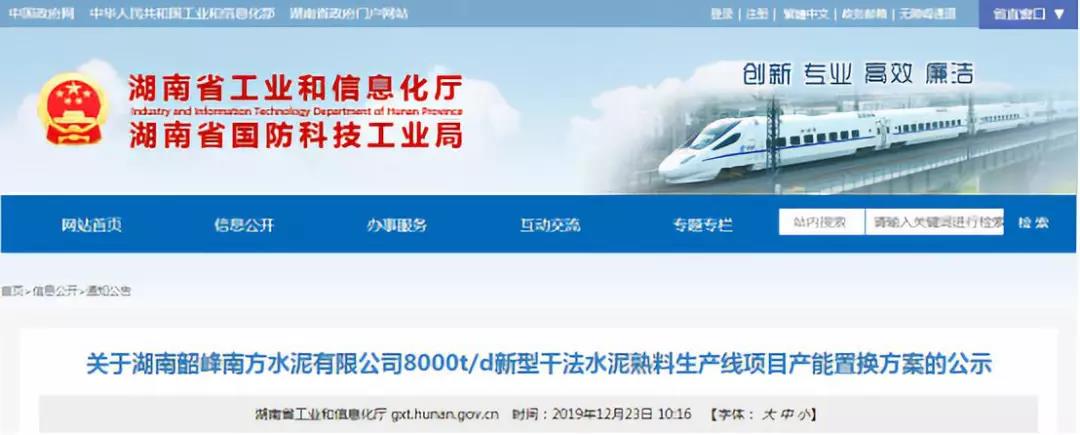 12月23日,湖南省工業(yè)和信息化廳發(fā)布了《關(guān)于湖南韶峰南方水泥有限公司8000t/d新型干法水泥熟料生產(chǎn)線項目產(chǎn)能置換方案的公示》,原文如下: