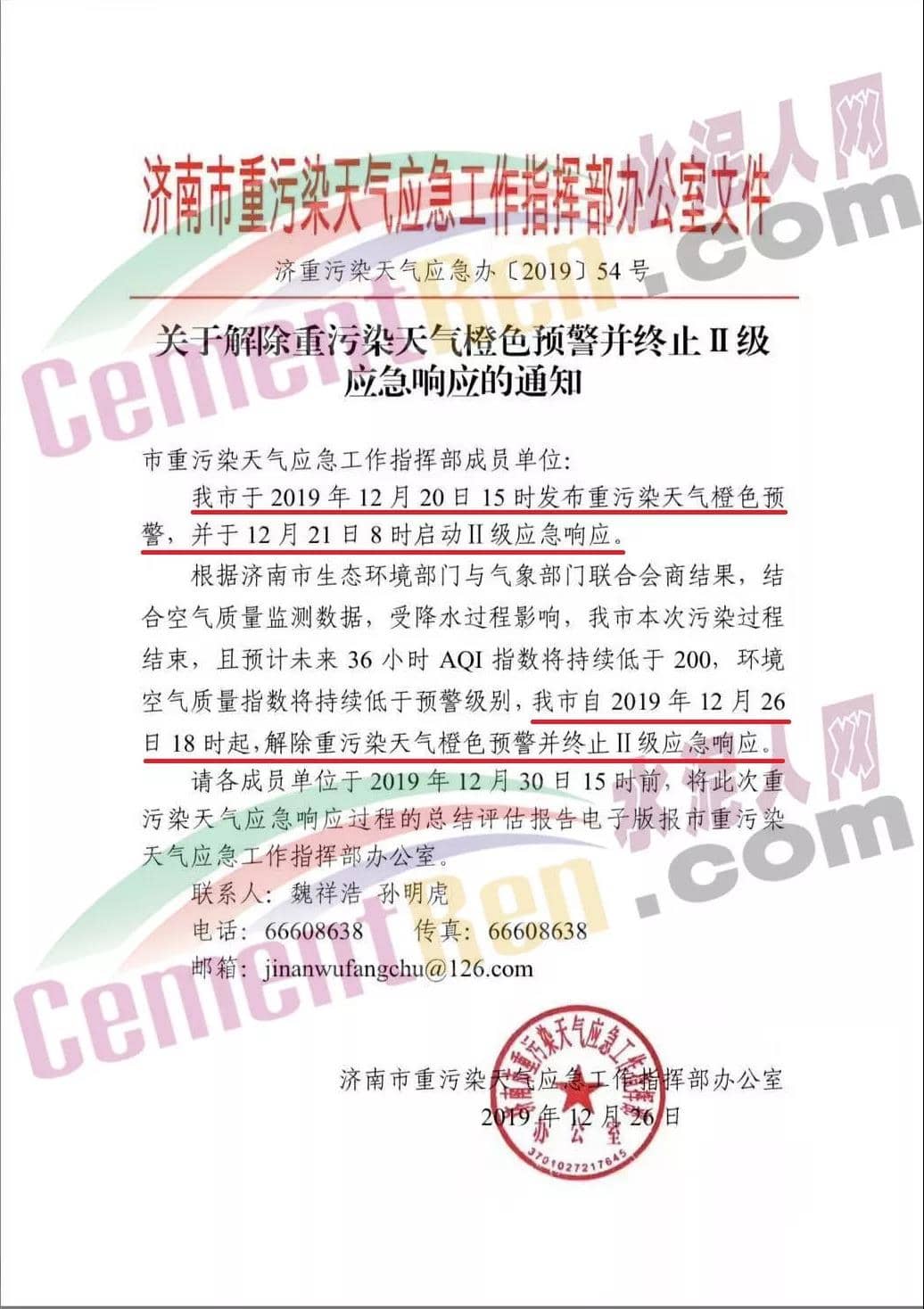 同期,山東省濟(jì)南市重污染天氣應(yīng)急工作指揮部辦公室發(fā)布了《關(guān)于解除重污染天氣橙色預(yù)警并終止II級(jí)應(yīng)急響應(yīng)的通知》稱,自2019年12月26日18時(shí)起,解除重污染天氣橙色預(yù)警并終止II級(jí)應(yīng)急響應(yīng)。通知原文如下: