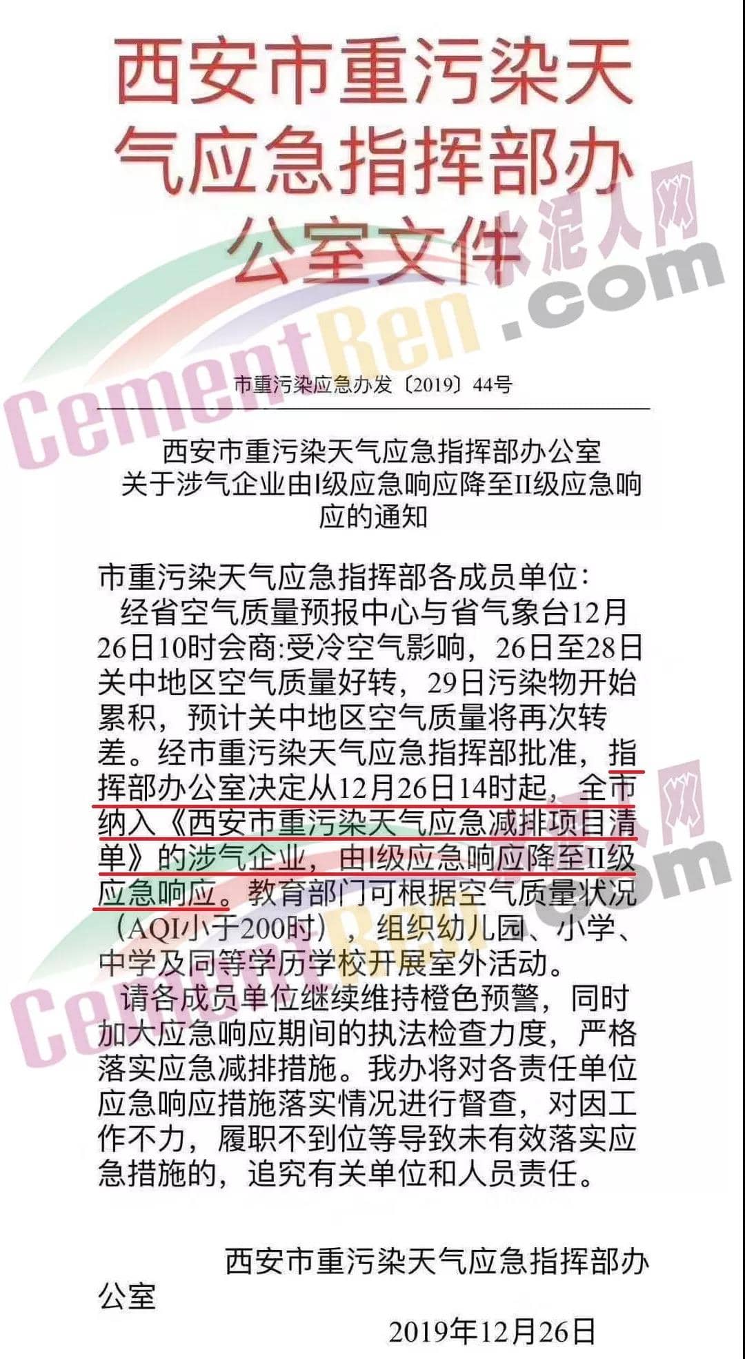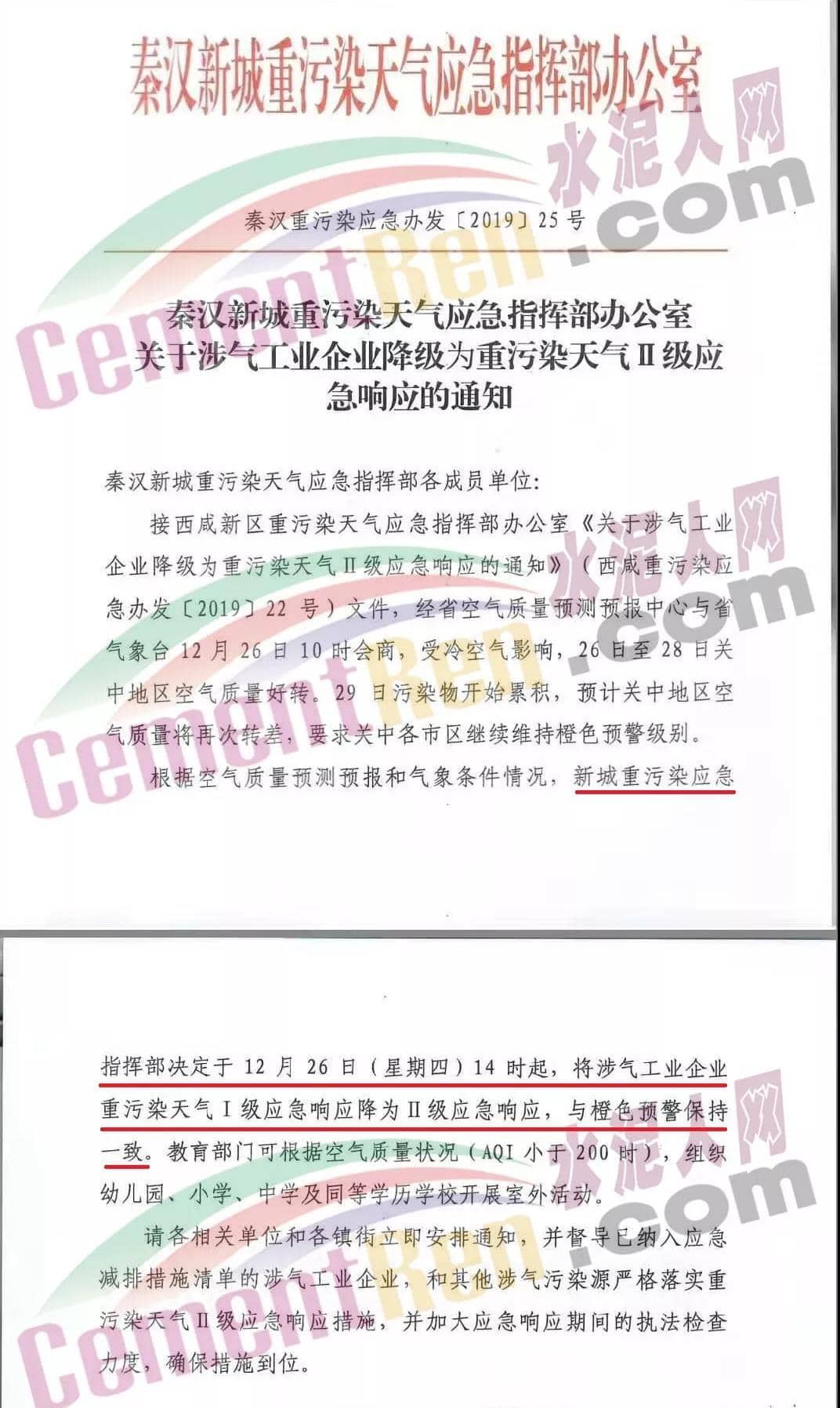 12月26日,陜西省西安市重污染天氣應(yīng)急指揮部辦公室發(fā)布了《關(guān)于涉氣企業(yè)由I級(jí)應(yīng)急響應(yīng)降至II級(jí)應(yīng)急響應(yīng)的通知》稱,西安市指揮部辦公室定于12月26日14時(shí)起,全西安市納入《西安市重污染天氣應(yīng)急減排項(xiàng)目清單》的涉氣企業(yè),由I級(jí)應(yīng)急響應(yīng)降至II級(jí)應(yīng)急響應(yīng)。通知原文如下: