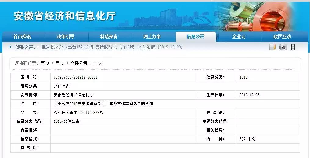 為加快智能制造發(fā)展,推進(jìn)制造強(qiáng)省建設(shè),推動我省制造業(yè)高質(zhì)量發(fā)展,根據(jù)《關(guān)于印發(fā)安徽省智能工廠和數(shù)字化車間認(rèn)定管理暫行辦法的通知》(皖經(jīng)信裝備〔2017〕181號)和《關(guān)于開展2019年支持制造強(qiáng)省建設(shè)若干政策和大力促進(jìn)民營經(jīng)濟(jì)發(fā)展若干意見相關(guān)項(xiàng)目申報(bào)工作的通知》(皖經(jīng)信財(cái)務(wù)〔2019〕136號)要求,經(jīng)申報(bào)、核查、評審、比對、公示等環(huán)節(jié),確定2019年安徽省智能工廠20個(gè)和數(shù)字化車間100個(gè),現(xiàn)將名單(見附件)予以公布。