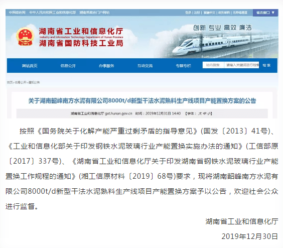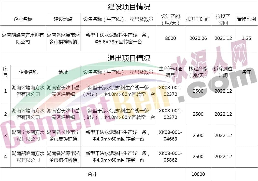 昨日(12月31日),湖南省工業(yè)和信息化廳發(fā)布了《關(guān)于湖南韶峰南方水泥有限公司8000t/d新型干法水泥熟料生產(chǎn)線項(xiàng)目產(chǎn)能置換方案的公告》,原文如下: 產(chǎn)能置換方案如下: 上述方案顯示,湖南韶峰南方水泥有限公司將在湖南省湘潭市湘鄉(xiāng)市棋梓橋鎮(zhèn)擬建一條日產(chǎn)8000噸熟料生產(chǎn)線(Φ5.6×78m回轉(zhuǎn)窯),擬2020年6月開工,2021年12月投產(chǎn)。