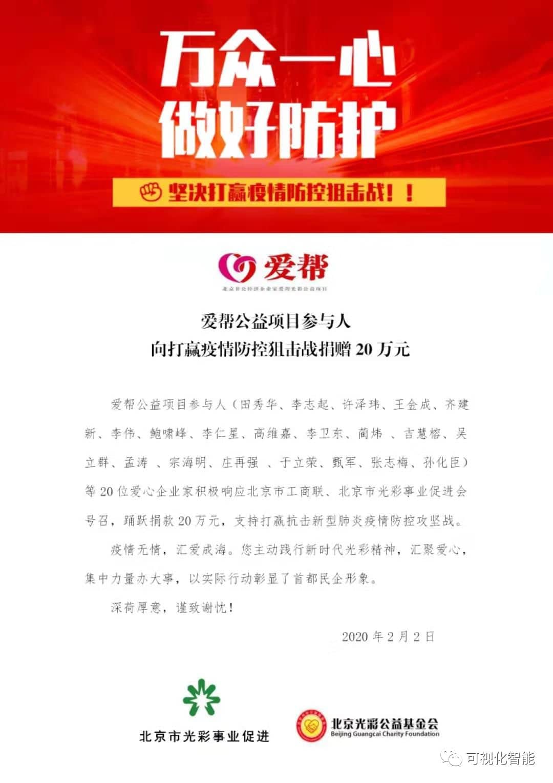 北京可視化智能科技公司始終踐行企業(yè)社會責任,將與各方風雨同舟、共克時艱。面對疫情,我們毫不退縮,我們堅信在黨中央的正確領導及各方的共同努力下,定能打贏這場沒有硝煙的疫情防控戰(zhàn)。待到冬去春來,我們一起看花開!
