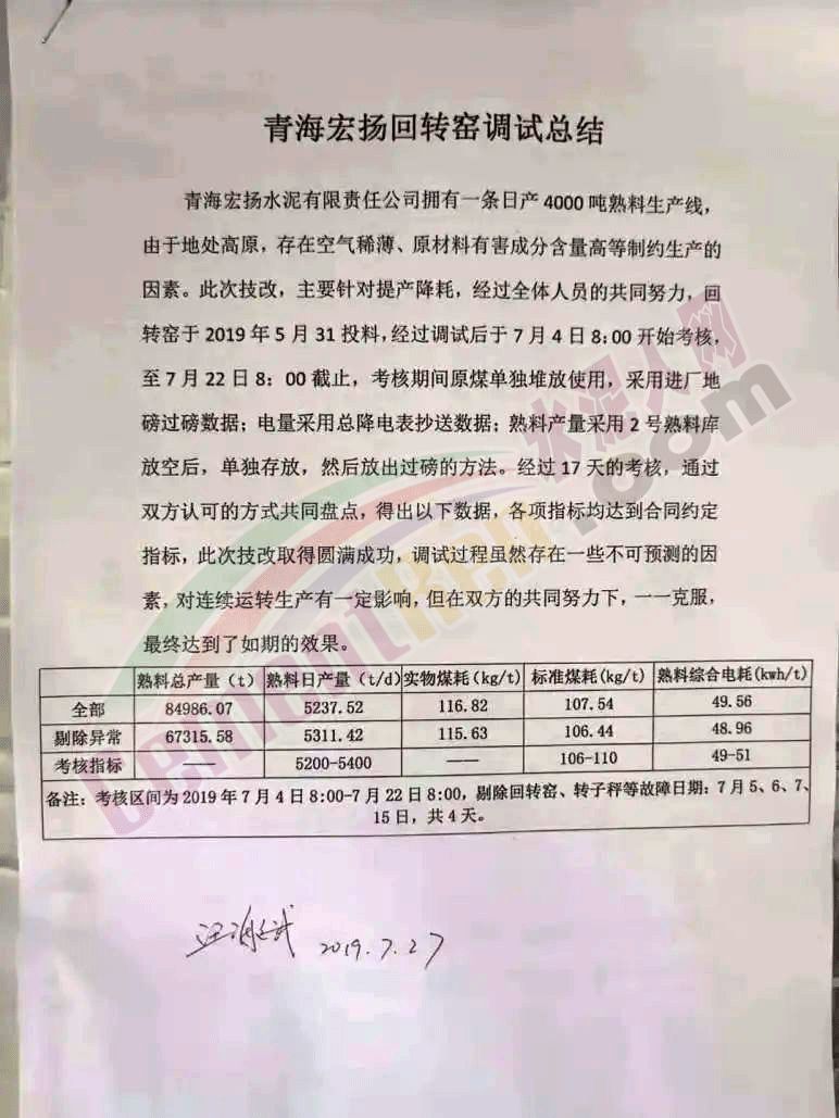 生產(chǎn)部長第一個簽字認(rèn)可,蔡總已高升為常務(wù)副總,全面主持宏揚分公司工作,也是第一時間給予肯定。由于各生產(chǎn)線情況不同,所以針對這次所取得的生產(chǎn)指標(biāo):電耗低于50kwh,標(biāo)煤耗106.5kg,摻加危廢狀態(tài)下產(chǎn)量始終保持了5300t/d的水平,在平原上講真的不算什么;但根據(jù)當(dāng)?shù)氐牡乩憝h(huán)境和原材料狀況來看,設(shè)計院卻也很客觀的給出了正常產(chǎn)量4200-4300的核算依據(jù)。