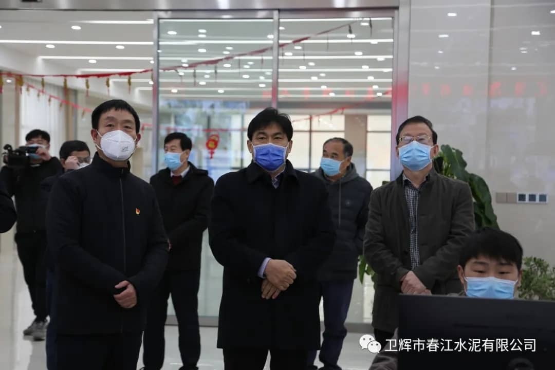 ▲新鄉(xiāng)市委書記張國(guó)偉一行在水泥公司中控室聽(tīng)取裴春亮?xí)洀?fù)工復(fù)產(chǎn)情況匯報(bào)