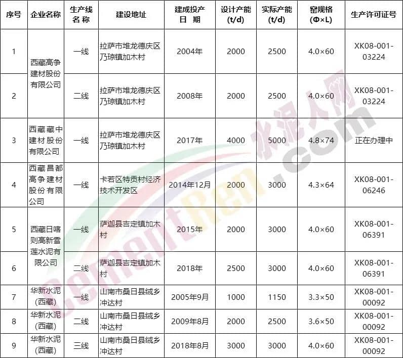 西藏自治區(qū)工信廳2019年未公布的生產(chǎn)清單顯示,截止上年未,西藏自治區(qū)共有9條熟料生產(chǎn)線,設計產(chǎn)能約615萬噸/年。