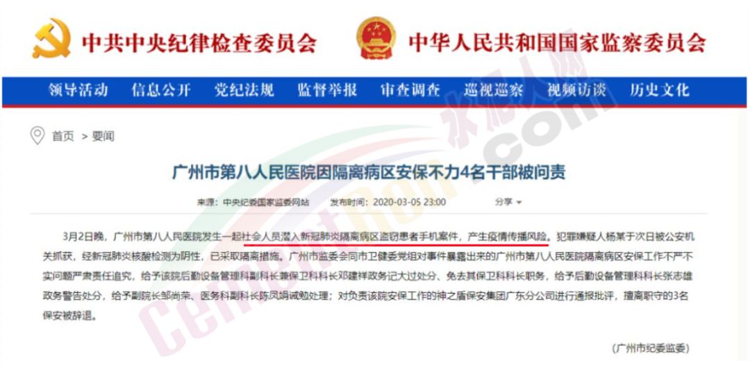 廣州市監(jiān)委會(huì)同市衛(wèi)健委黨組對(duì)事件暴露出來的廣州市第八人民醫(yī)院隔離病區(qū)安保工作不嚴(yán)不實(shí)問題嚴(yán)肅責(zé)任追究,給予該院后勤設(shè)備管理科副科長(zhǎng)兼保衛(wèi)科科長(zhǎng)鄧建祥政務(wù)記大過處分、免去其保衛(wèi)科科長(zhǎng)職務(wù),給予后勤設(shè)備管理科科長(zhǎng)張志雄政務(wù)警告處分,給予副院長(zhǎng)鄒尚榮、醫(yī)務(wù)科副科長(zhǎng)陳鳳娟誡勉處理;