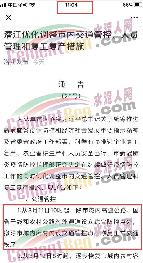 3月11日8時(shí)33分時(shí),湖北省潛江市新型冠狀病毒肺炎疫情防控指揮部發(fā)布26號(hào)通告稱,從3月11日10時(shí)起,除市域內(nèi)高速公路、國(guó)省干線和農(nóng)村公路對(duì)外通道設(shè)立綜合防控點(diǎn)外,撤除市域內(nèi)所有內(nèi)設(shè)交通管控點(diǎn),恢復(fù)正常交通秩序;從3月12日8時(shí)起,逐步恢復(fù)市域內(nèi)農(nóng)村客運(yùn)、公交客運(yùn)、出租客運(yùn)以及渡口碼頭(跨市域渡口除外)。具體運(yùn)行嚴(yán)格按照《市交通運(yùn)輸局關(guān)于做好交通運(yùn)輸企業(yè)復(fù)工復(fù)產(chǎn)工作的通知》執(zhí)行。