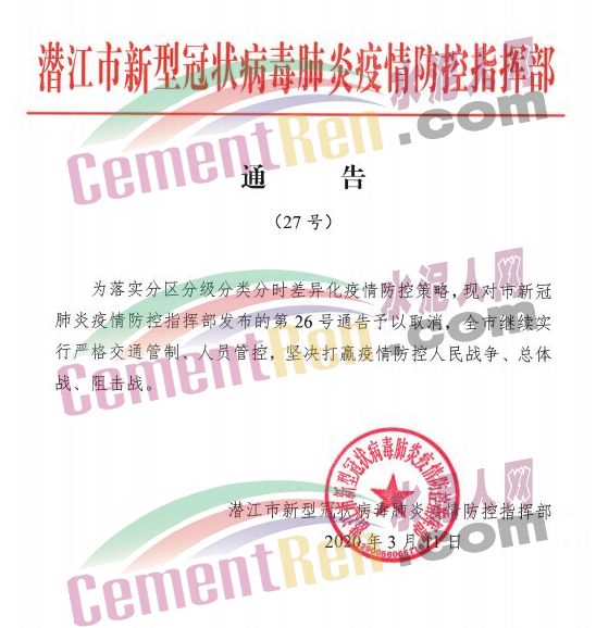 3月11日10時(shí)32分潛江市新型冠狀病毒肺炎疫情防控指揮部發(fā)布27號(hào)通告稱,對(duì)市新冠肺炎疫情防控指揮部發(fā)布的第26號(hào)通告予以取消,全市繼續(xù)實(shí)行嚴(yán)格交通管制、人員管控,堅(jiān)決打贏疫情防控人民戰(zhàn)爭(zhēng)、總體戰(zhàn)、阻擊戰(zhàn)。