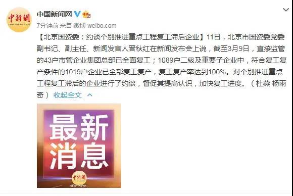 3月11日,北京市國(guó)資委黨委副書(shū)記、副主任、新聞發(fā)言人晉秋紅在新聞發(fā)布會(huì)上說(shuō),截至3月9日,直接監(jiān)管的43戶(hù)市管企業(yè)集團(tuán)總部已全面復(fù)工;1089戶(hù)二級(jí)及重要子企業(yè)中,符合復(fù)工復(fù)產(chǎn)條件的1019戶(hù)企業(yè)已全部復(fù)工復(fù)產(chǎn),復(fù)工復(fù)產(chǎn)率達(dá)到100%。對(duì)個(gè)別推進(jìn)重點(diǎn)工程復(fù)工滯后的企業(yè)進(jìn)行了約談,督促其提高認(rèn)識(shí),加快復(fù)工進(jìn)度。