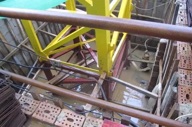 基礎(chǔ)下沉形式是指塔吊基礎(chǔ)底面低于±0.00標(biāo)高,置于地下室基坑底部標(biāo)高位置的形式。對于這種塔吊基礎(chǔ)處理形式,應(yīng)關(guān)注塔吊基礎(chǔ)部分的排水,避免積水。廈門市去年曾發(fā)生一起由于塔吊基礎(chǔ)節(jié)積水,影響司機(jī)、檢查人員檢查而未能及時(shí)發(fā)現(xiàn)基礎(chǔ)節(jié)底座焊縫裂縫,再加上焊縫處鋼材疲勞損傷嚴(yán)重而發(fā)生的倒塔事故。