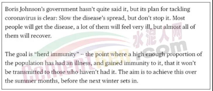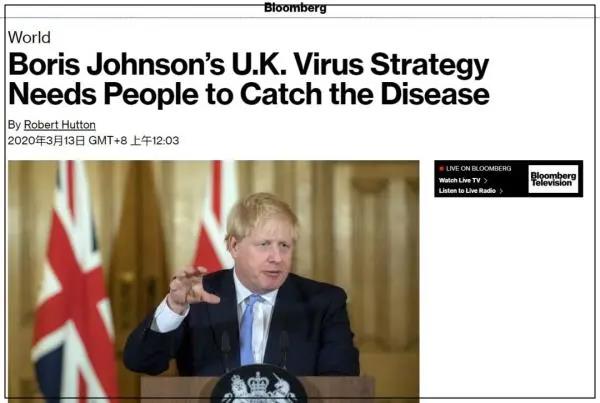 在一篇名為“鮑里斯·約翰遜的英國病毒防疫策略,是讓人們都去感染病毒”的報道中,彭博社就表示:雖然約翰遜的政府沒有明著說出“讓所有人都去得病”這句話,但他們策略中的這個意圖已經(jīng)很明顯了,即要放緩病毒的傳播,但并不是去完全控制這個病毒,讓人們在今年夏季慢慢地去感染,然后逐漸康復(fù),進而在冬天之前達(dá)到“人群免疫”(herd immunity)的目標(biāo)。