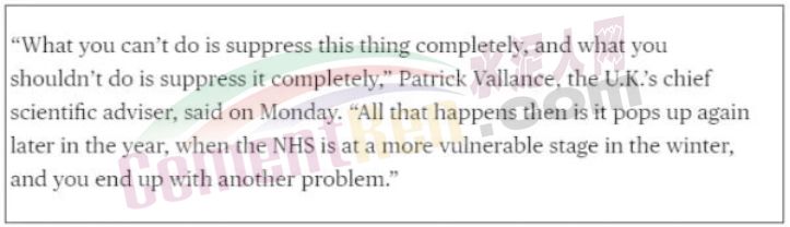 彭博社還引用英國政府首席科技顧問帕德里克·瓦倫斯的說法稱,冬季是英國醫(yī)療系統(tǒng)最脆弱的時候,如果病毒于2020年底的冬天再次襲來,就會產(chǎn)生額外的問題。所以,從他的說法來看,英國政府采取這種策略的原因,是趁著春天到來,天氣回暖,讓英國人在冬天之前都獲得對病毒免疫的能力,這樣到了2020年底冬季如果疫情再出現(xiàn)就不怕了。