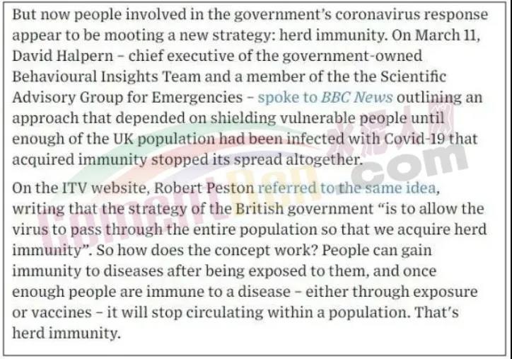 英國科技媒體Wired UK也在一篇報道中,通過引述英國BBC和ITV等媒體對于英國政府顧問的采訪和報道,認(rèn)為英國政府對于新冠病毒疫情的殺手锏,就是通過讓足夠多的人感染病毒并康復(fù)過來,來實現(xiàn)“人群免疫”。