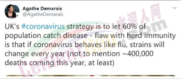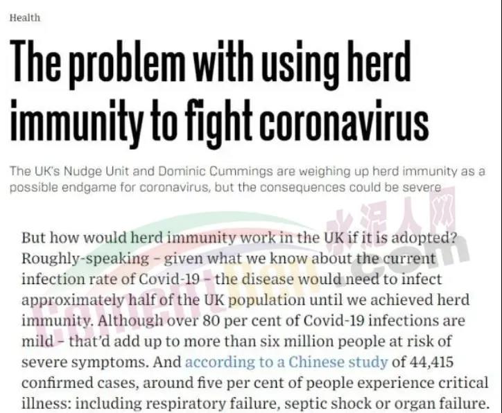 不過,這家媒體卻認(rèn)為英國政府的這種策略問題很大,甚至?xí)斐蓢?yán)重的后果:實現(xiàn)人群免疫,至少需要一半的英國人口感染這種病毒,盡管80%的感染者是輕癥,這卻仍會令剩下的600多萬人處于重癥的風(fēng)險之下——而且中國的研究還發(fā)現(xiàn)5%的感染者會出現(xiàn)病危的癥狀,比如呼吸衰竭,器官衰竭等等。