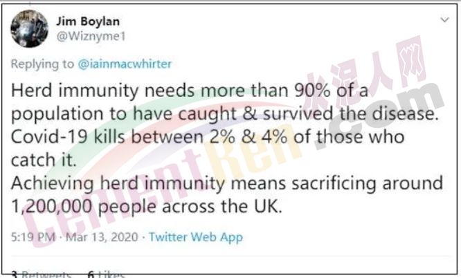 有網(wǎng)民還表示,人群免疫需要90%的人感染病毒并生存下來,而新冠病毒的致死率是2%到4%,這也就意味著為了在英國實現(xiàn)這個目標(biāo)得犧牲大約120萬人。