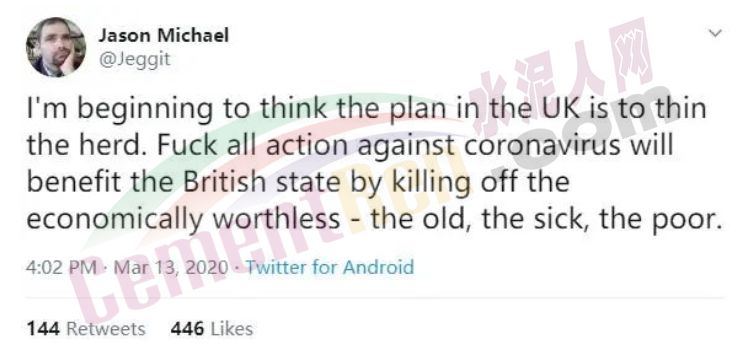 一位來自蘇格蘭的網(wǎng)民甚至認(rèn)為英國的政府就是淘汰“經(jīng)濟弱勢群體”,讓那些老人、病人和窮人都去死。